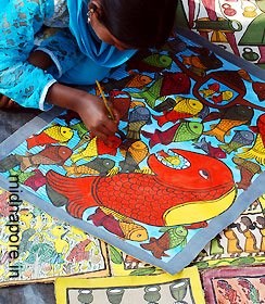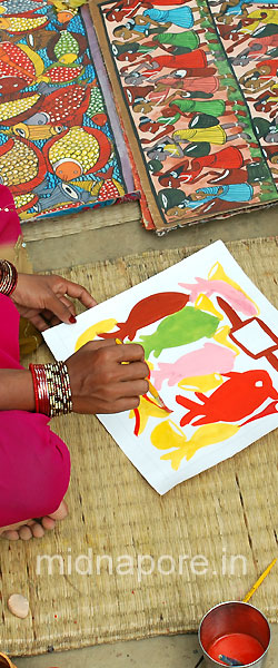 It was popular among Hindu tribes like Santhals, Hos, Munda, Juangs and Kherias who painted ‘Patachitras' depicting the birth of their first ancestors Pilchu Haram and Pilchu Burhi; how they had seven sons and seven daughters and how these seven brothers were married to their sisters. With the growing influence of Buddhism, the Patuas embraced the faith. Buddhist kings and monks made extensive use of scroll paintings to preach Buddhism and during this time Patachitra probably spread to Bali, Java, Sri-Lanka , Malaysia and Tibet . With Muslim invasions, Islam spread and the Chitrakars became followers of Islam.